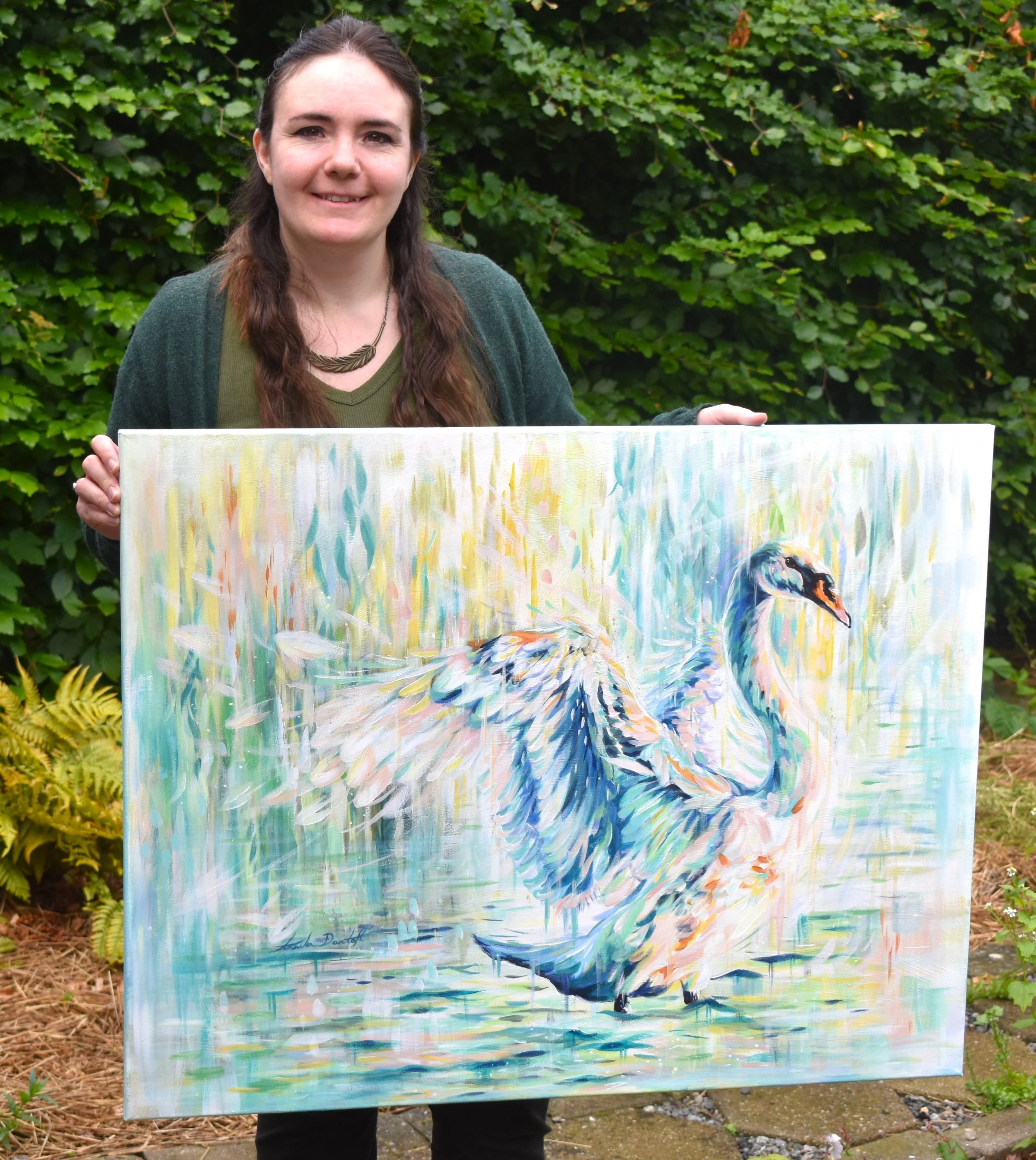 This painting of a swan is an embrace of green tones and lively brushwork. The piece is very light and yet colorful with many different colors. The swan flaps its wings and shows how big and beautiful it is. The bird is painted with big brushstrokes. The background is hinting at a tree hanging its leaves down to the water.